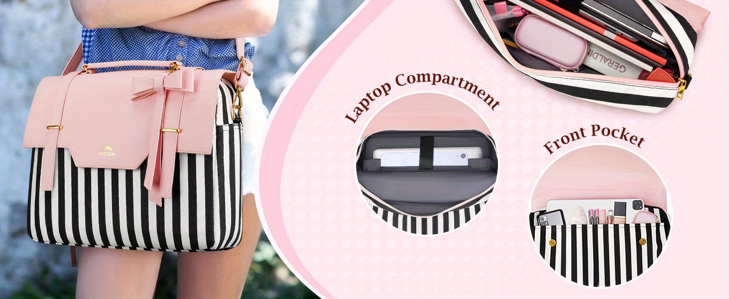 This stylish and versatile 3-in-1 convertible laptop bag is perfect for modern women on the go. Featuring a charming bow accent and bold striped design, it easily transitions between a backpack, crossbody bag, or handbag. Made with PU leather and durable polyester, this bag provides a spacious interior, padded laptop sleeve, and multiple compartments for organized storage. Ideal for work, college, travel, or daily outings.